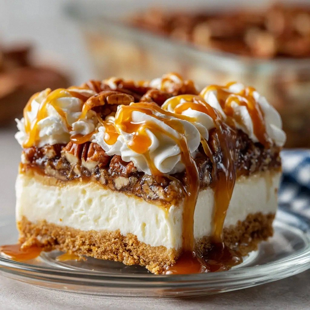 Swap the pecans for dark chocolate chips and drizzle a thin chocolate ganache on top. The bittersweet chocolate balances the sweet layers, creating a dessert that feels like a chocolate pecan pie. This version is great for chocolate lovers.